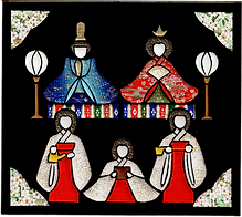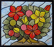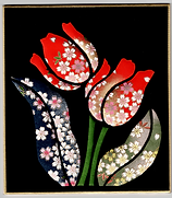 絵の1片1片を友禅和紙で包み、一枚一枚を黒などの細い線“目地”で形取ります。